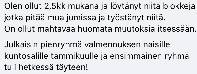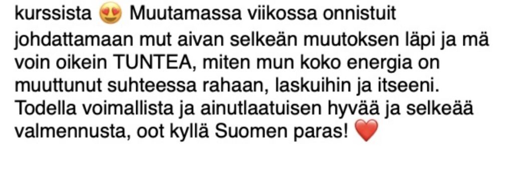- jotta sulla on tämän valmennuksen jälkeen se KOKO energeettinen ja mielensisäinen peli hallussa ja kyky tästä eteenpäin aina tunnistaa itsesi jarruttelu ja sabotointi ja korjata sun energiaa ja toimintaa ennen kuin se sotkee sun tuloksia