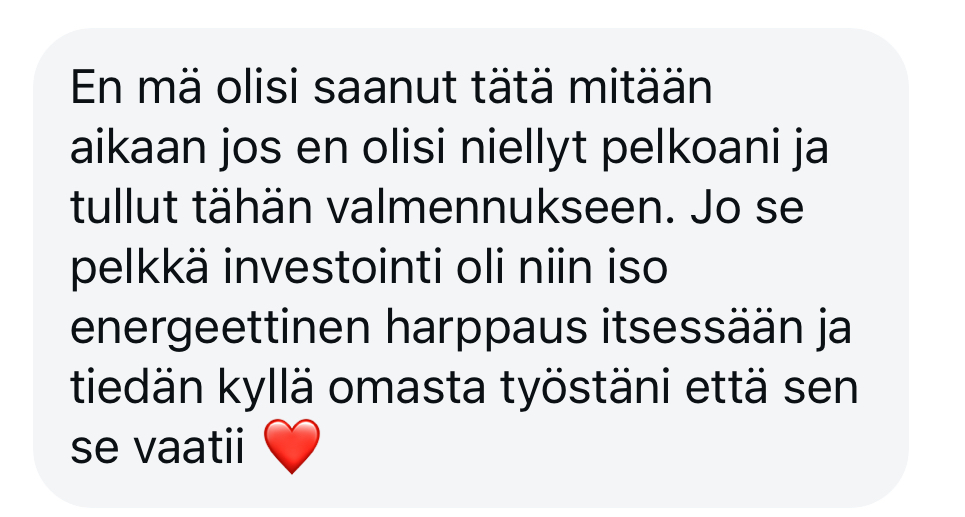 ja jarruttelin vuosia päätöstä astua selkeämmin bisnesvalmentajan rooliin, koska mun ego huusi joka päivä mun olkapäällä, että “sä ET OLE valmis sellaiseen”