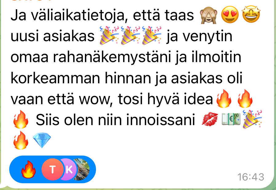 – sen sijaan viikosta toiseen rohkeat, päättäväiset ja nopeasti toimivat naiset (= mun unelma-asiakkaat) investoi mun tuhansien eurojen, korkean tason bisnesvalmennuksiin ja maksaa kerralla – enkä mä joudu enää käymään loputonta viestinvaihtoa aiheesta ennen ostopäätöstä