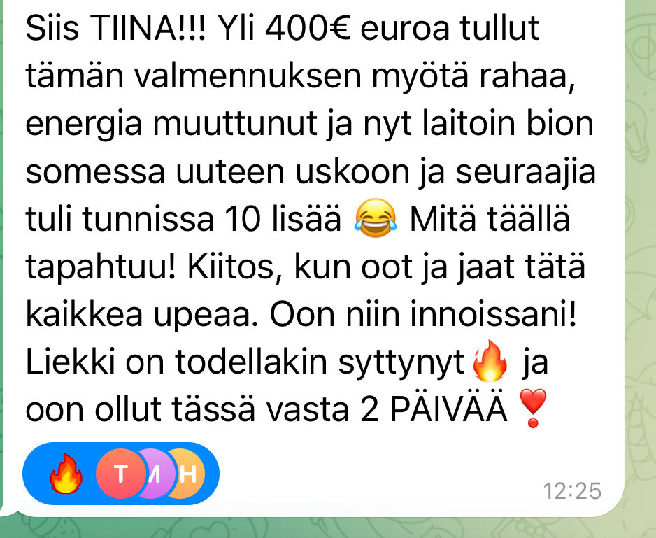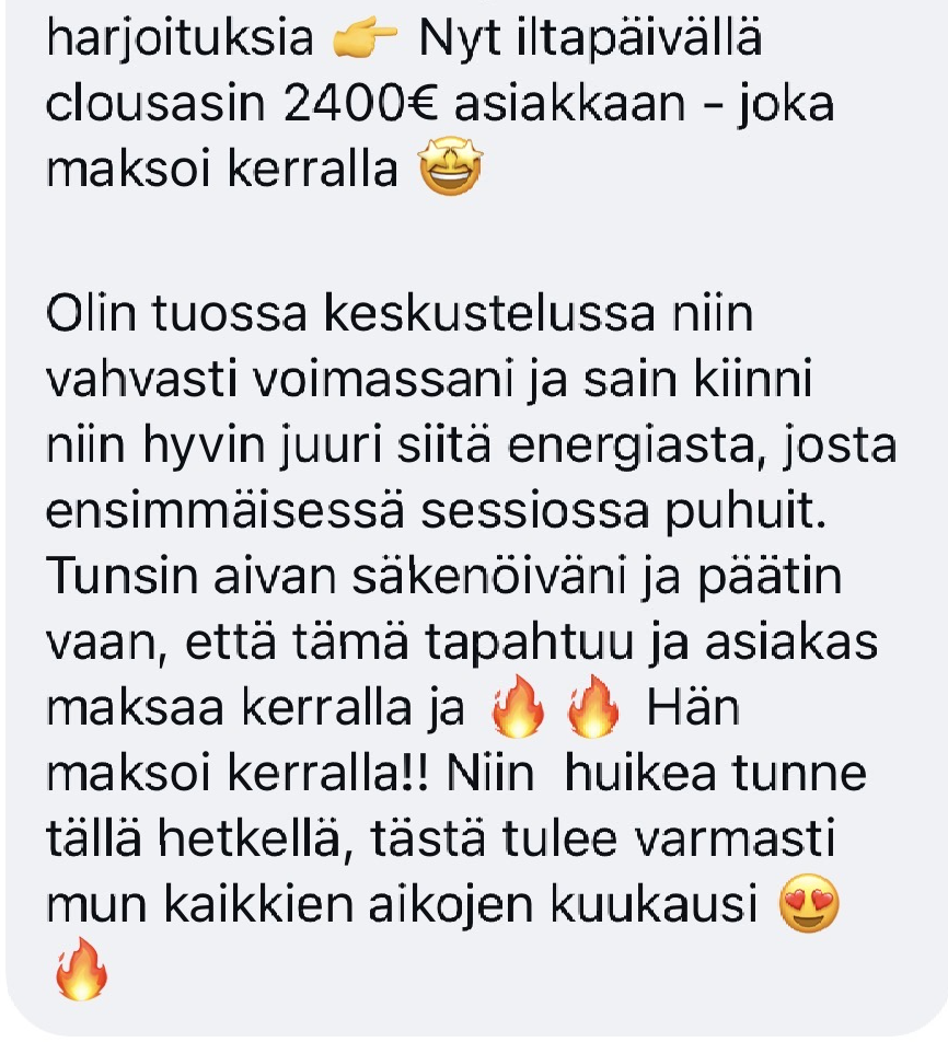 - jotta kaikki se strategia, jonka oppimiseen sä tähän asti oot investoinut aikaa ja rahaa, alkaa VIHDOINKIN tuomaan tuloksia, koska sun oma energia ei enää vastusta niiden tulosten syntymistä