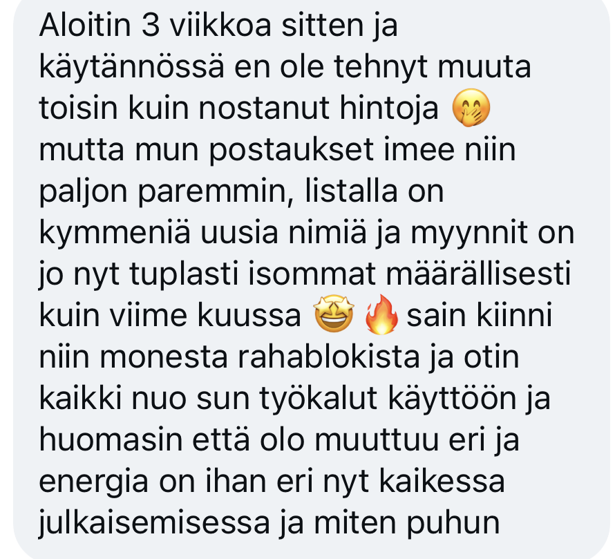 – ja siksi julkaiseminen on nyt nopeampaa. helpompaa ja tuloksellisempaa kuin ikinä aiemmin, koska mä en puhu enää miellyttääkseni ja inspiroidakseni. Mä uskallan puhua suoraan, aidosti ja itsevarmasti, ja siksi oikeat ihmiset tajuaa välittömästi, miksi heidän on PAKKO päästä työskentelemään mun kanssa